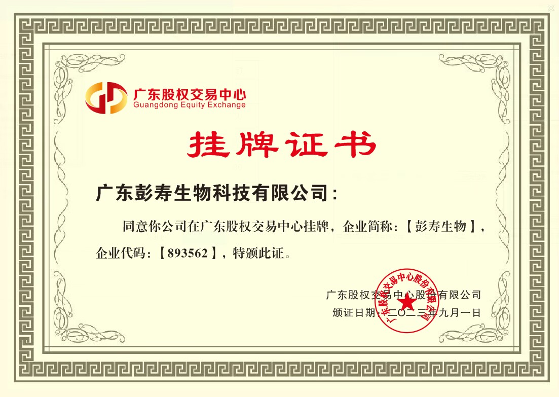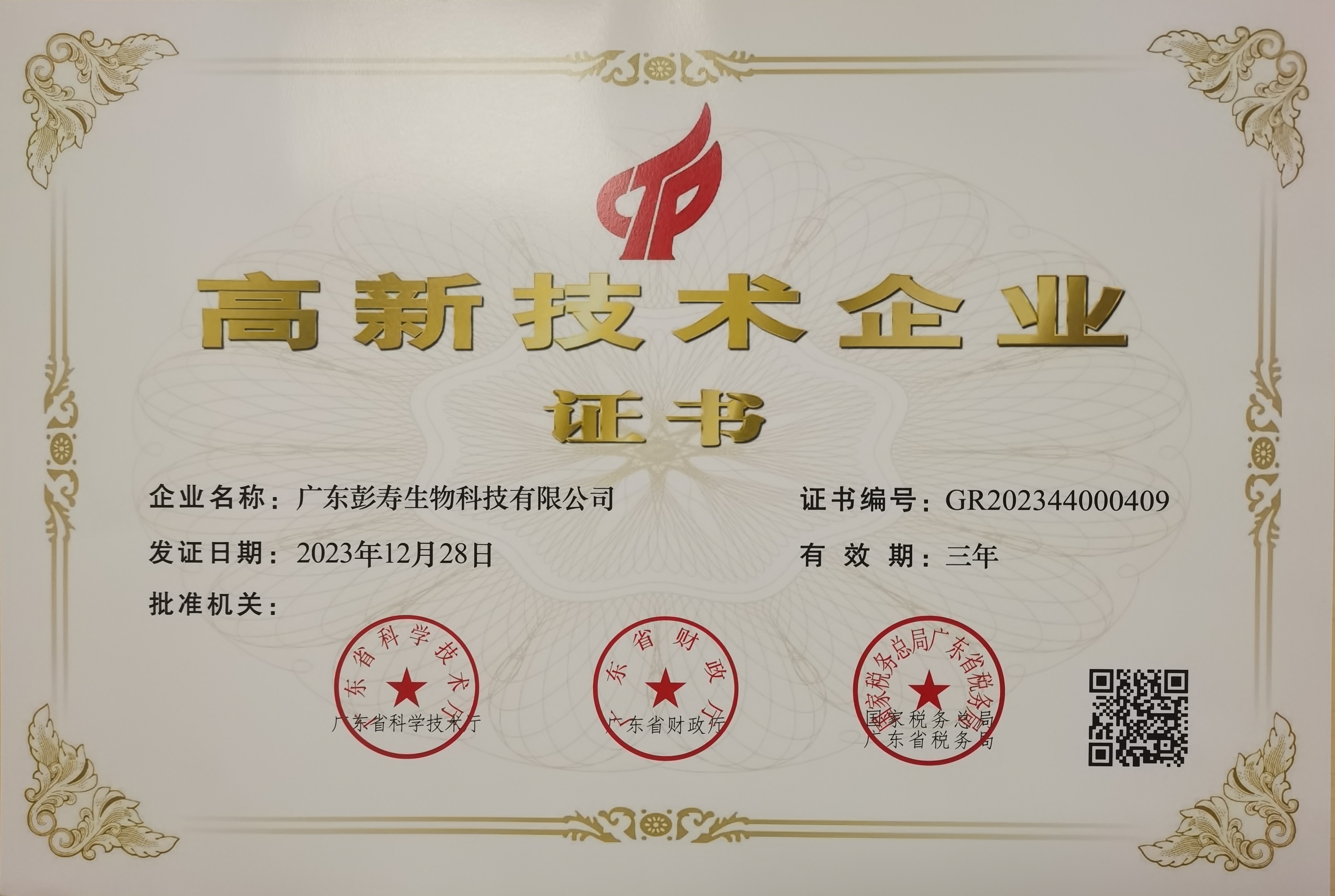 2017年12月,广东彭寿生物科技有限公司研制生产的“彭寿益生茶”产品被广东省高新技术企业协会认定为“广东省高新技术产品”资质认定证书 。